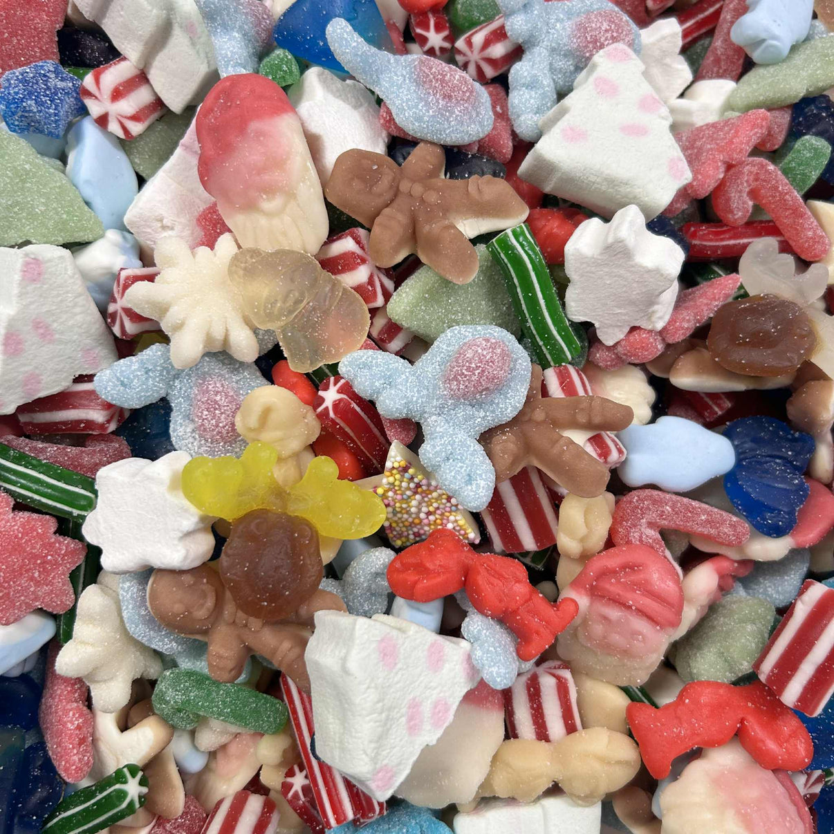 Mix of Christmas themed fizzy, non fizzy, chocolate, marshmallow Pick n Mix Sweets